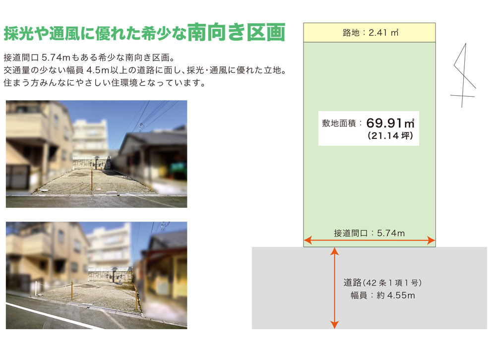 | 道 路 | 南側:42条1項1号/幅員:約4.55m、接道間口:5.74m | ||
